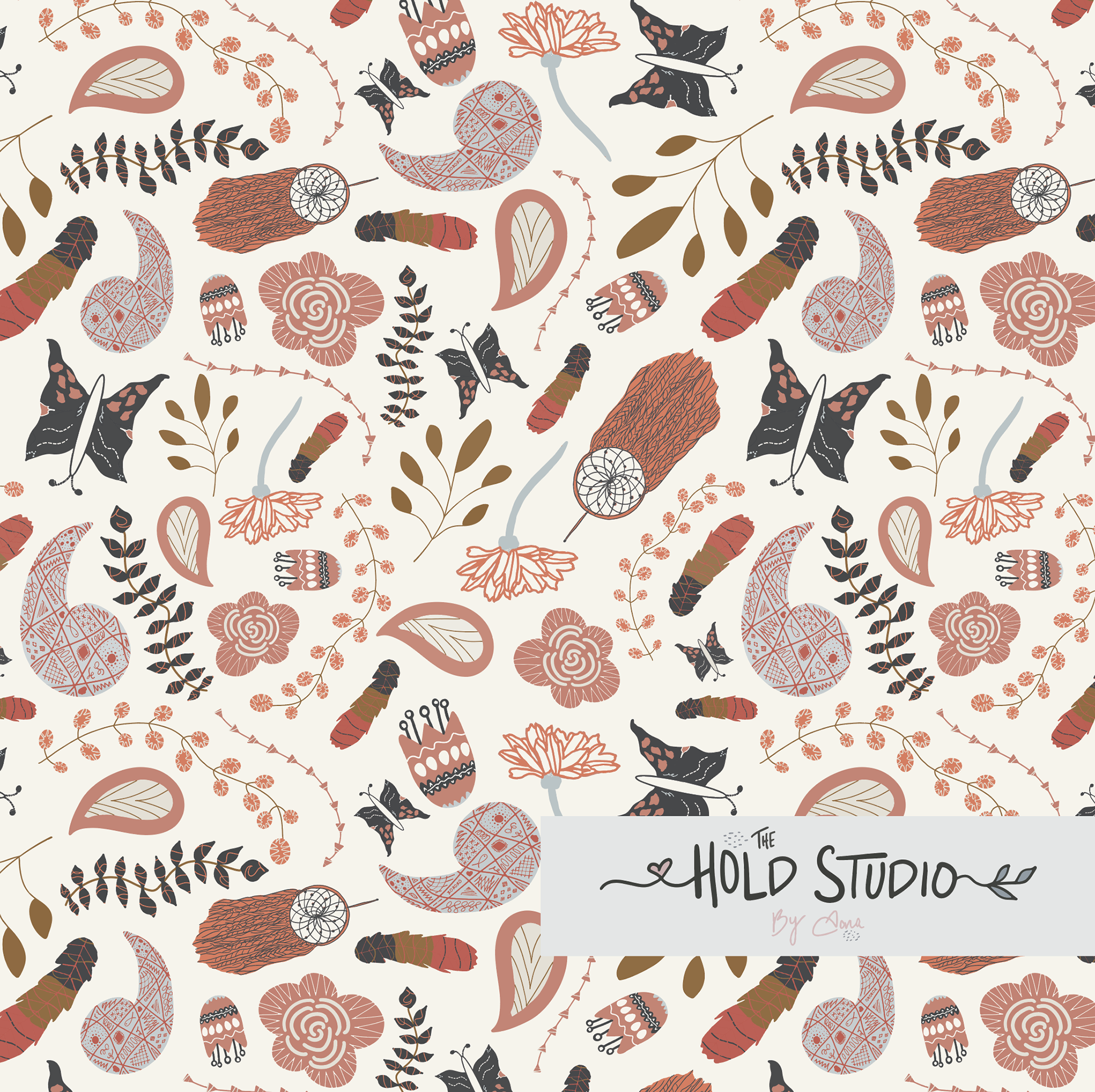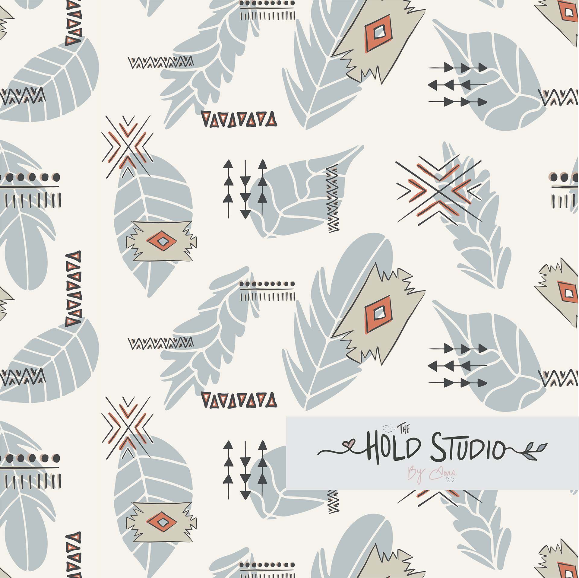 A tribal-inspired pattern collection incorporating peachy pinks, some lovely blues, and perfect neutral tones.